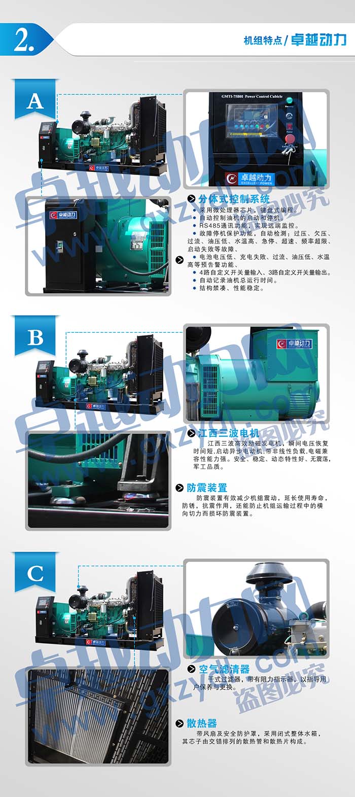 采用國內(nèi)先進的柴油發(fā)電機組專用多功能智能控制模塊,具有自動,手動啟動控制(可選)、自動保護功能、自動保護功能、自動市電/發(fā)電轉(zhuǎn)換、自動并機及遠程通訊和液晶顯示頻顯示各種參數(shù)等功能,有多種智能控制模塊供選擇。